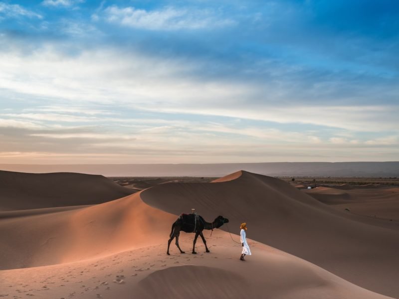 In the deep south of Morocco in the region of the southern Draa Valley and M’hamid the Sahara Desert is a beguiling wilderness of palm-filled oases, vast sand dunes, ancient lake-beds, camel caravans, adobe mud-brick villages and men in blue. Off-the-beaten-track and accessible by camel,…